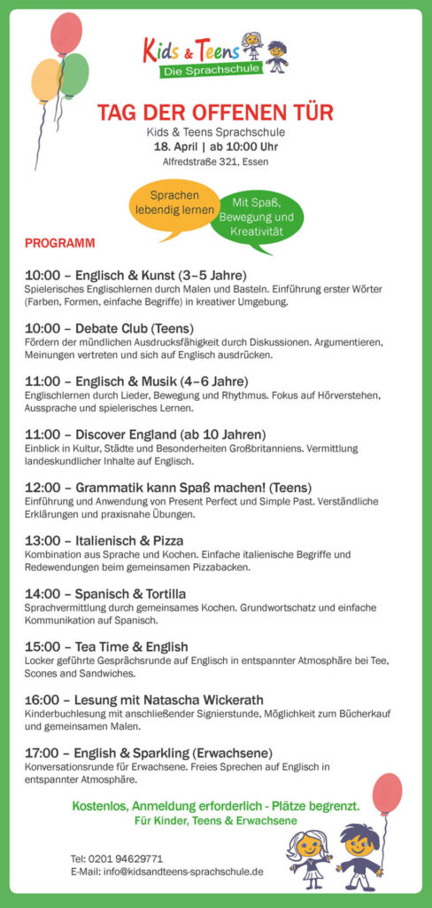 Wir bieten Oster-, Sommer- und Herbst-Feriencamps in Essen und Umgebung für Englisch, Spanisch und Italienisch mit einem ganzheitlichen Ansatz.
